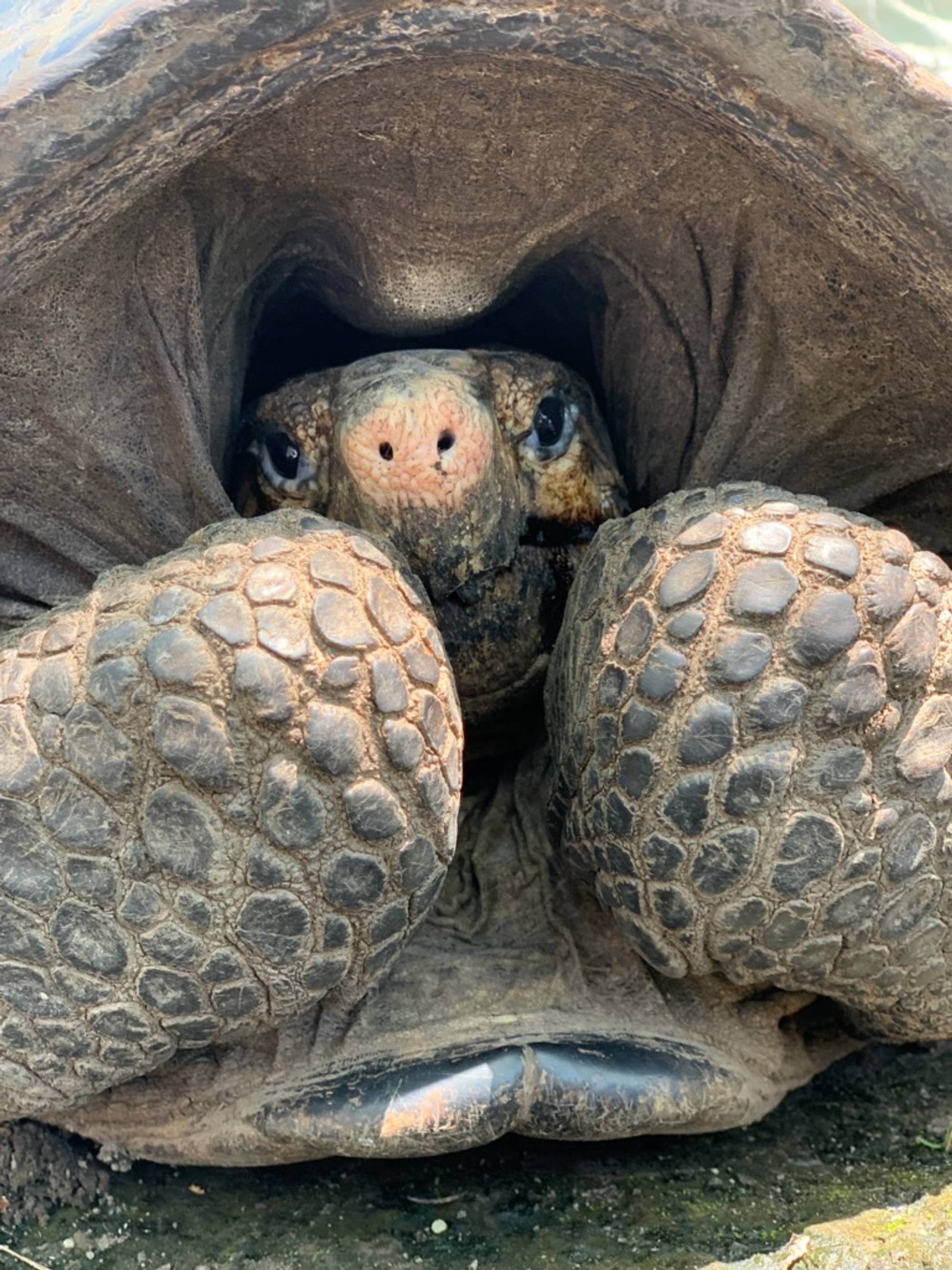 Having positively identified tortoise scat in the field, the team led by Galante successfully located an active bedding site before finding the animal nearby. The tortoise was found sheltering from the equatorial sun, buried deep under a pile of brush. A huge celebration ensued as all parties involved were able to positively identify the animal in question as an older female Chelonoidis phantasticus based on shell morphology and facial characteristics.