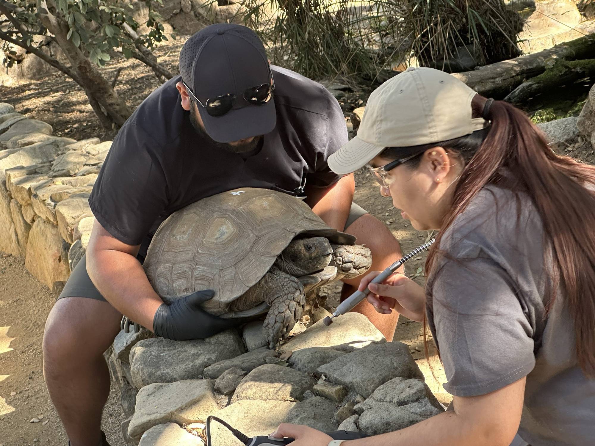 At the first station, students learned about tortoise beak trims. Tortoises possess continuously growing beaks, and captive tortoises sometimes require beak trims to maintain their beak length. Their beaks are keratin and lack any nerve endings, so while grinding the beak is not painful, most tortoises do not enjoy it and retract into their shells, further complicating the procedure. During this hands-on experience, students focused on Burmese black mountain tortoises, a large and incredibly strong Asian tortoise species. Using a dremel tool, students carefully ground down the tortoises' beaks, providing them with practical skills and insight into the complexities and physical demands of this task.
